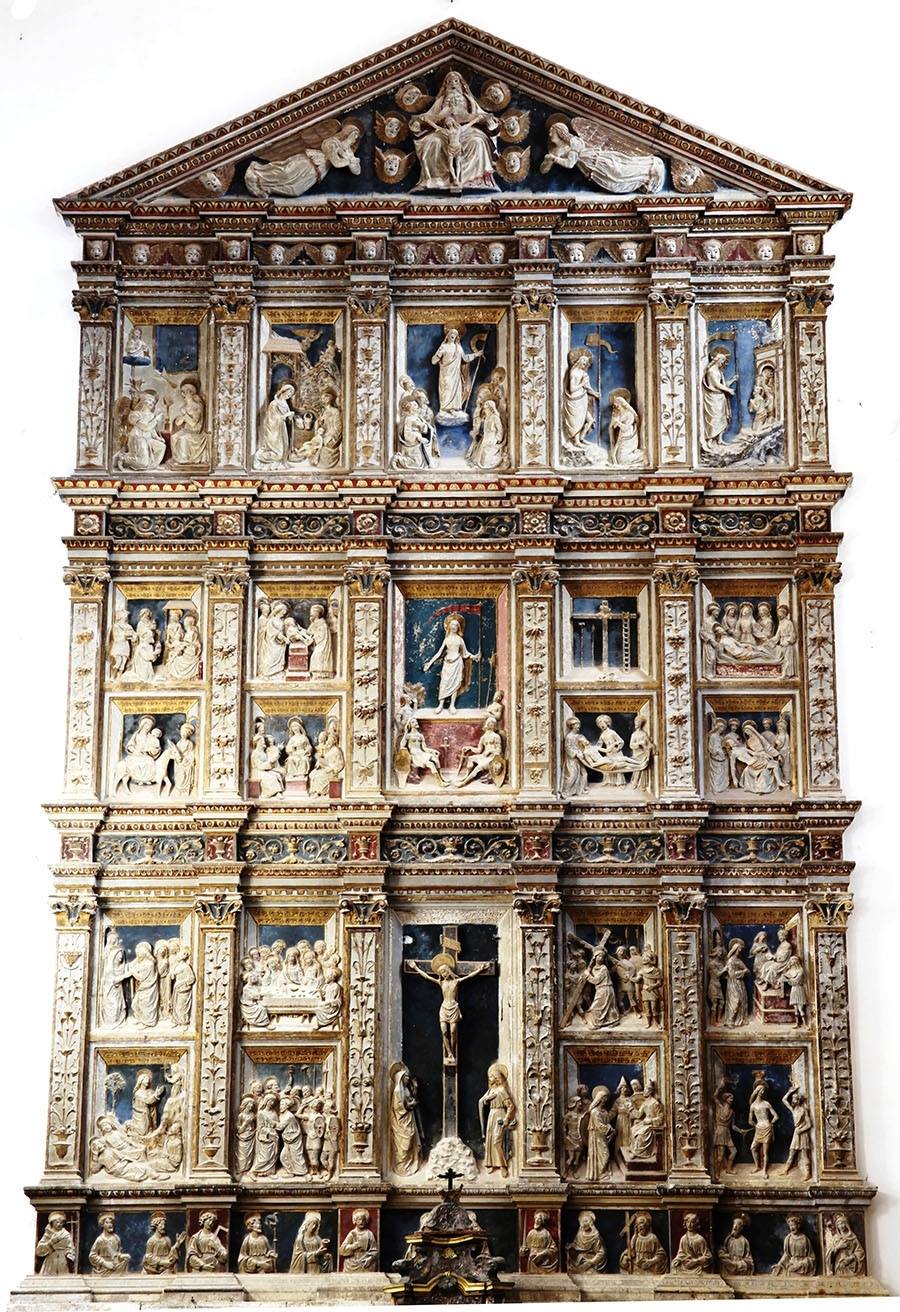Le altre tre fasce sono, dal basso verso l’alto, la prima quella delle girali floreali sostenute da mensole a dentelli e fasce a ovuli a fusaiola intervallate da vasi. La seconda fascia poggia sempre su fasce di dentelli e ovuli a fusarola: è decorata con motivi di girali con palma, intervallate da rose sucerchi, che si alternano a fiori su quadrati. La terza fascia è composta da diciassette putti alati, che rappresentano l’armonia delle sfere, che sorreggono e sono sorretti dalle fasce a dentelli e ovuli a fusarola. Il polittico è ulteriormente diviso verticalmente con delle fasce a motivi di candelabri rinascimentale, sormontate da capitelli compositi. In tutto si contano 23 spazi come scatole prospettiche con cassettoni che racchiudono le immagini della vita di Gesù. I 23 spazi sono delle vere e proprie opere d’arte.