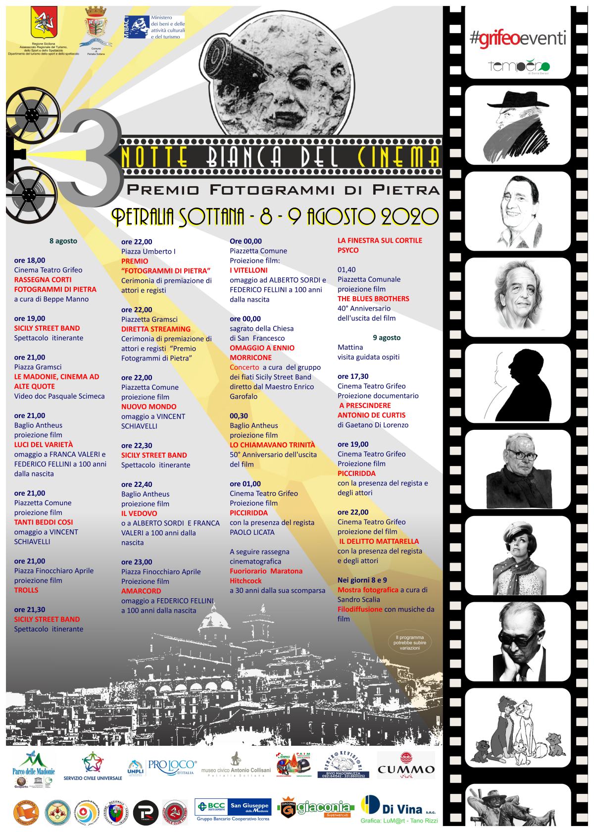Tra le tante iniziative in programma è prevista la consegna dei premi “Fotogrammi di Pietra” ad attori e registi tra cui Aurelio Grimaldi per il film Il Delitto Mattarella, presente con alcuni attori del cast, tra cui David Coco (che impersona Piersanti Mattarella nel film) Paolo Licata con il film Picciridda, Alessio Vassallo, (Mimì nel Commissario Montalbano). E poi ancora l’indimenticato Toto’ Cascio di Nuovo Cinema Paradiso, per ricordare la figura del grande attore Vincent Schiavelli ci sarà anche la compagna e attrice Katia Vitale, l’attore Filippo Luna, Ivan Scinardo e tanti altri si uniranno a questo elenco. Per tutta la notte nelle piazze ,nei vicoli,saranno proiettati film, cortometraggi e anticipazioni di nuovi film. Non ci si limiterà pero’ ad una attività meramente cinematografica:nelle suggestive locations del centro storico, ci saranno mostre, workshop ,intrattenimenti musicali con le migliori colonne sonore, angoli gastronomici rievocativi della storia cinematografica e televisiva. Una sezione particolare ,in apertura della kermesse, sarà dedicata alla proiezione di cortometraggi. A presentare gli ospiti sarà Elvira Terranova.
