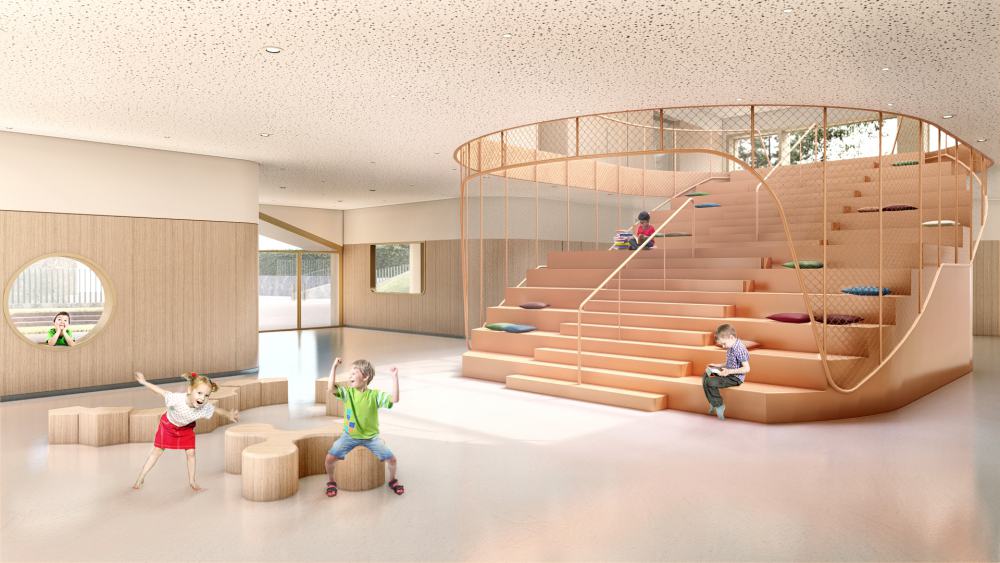 Una organizzazione dei luoghi con spazi modulari facilmente configurabili in grado di rispondere a contesti educativi diversi e ambienti plastici e flessibili, funzionali a modelli di insegnamento avanzati e non ancorati alla didattica delle lezioni frontali. Previste attività didattiche esterne con la cura di orti didattici e la fruizione del giardino degli odori e ci sarà anche un’aula verde. La sala mensa sarà polivalente in grado di diventare un luogo di incontro o palestrina per i più piccini. Adiacente sarà realizzata un laboratorio per le attività musicali con pareti scorrevoli in grado di ospitare incontri culturali. Prevista una biblioteca con attrezzature multimediali e l’agorà dove ci sarà il famoso laboratorio astronomico/meteorologico.
