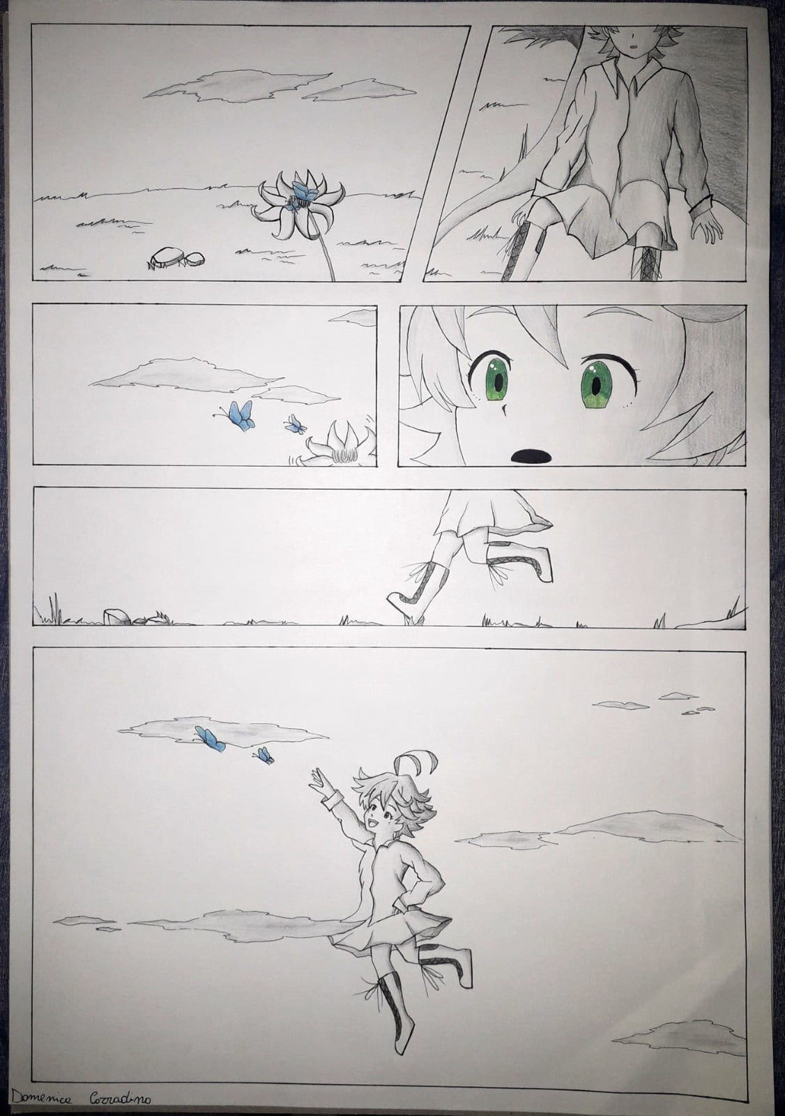 Nel suo elaborato, realizzato con la tecnica del fumetto a matita, Domenica, fa prevale il bianco e nero, e racconta di una bimba che, con occhi pieni di gioia, libera, correre felice in mezzo alle farfalle che svolazzano intorno a lei. Il senso della gioia è evidente e anche in questo caso; la simbologia ha un suo spazio ben preciso e ricercato: la scelta di colorare solo gli occhi verdi e le farfalle blu, simbolo di rinascita, dimostra quanto l’alunna abbia instaurato una connessione con lo spirito di Valeria.