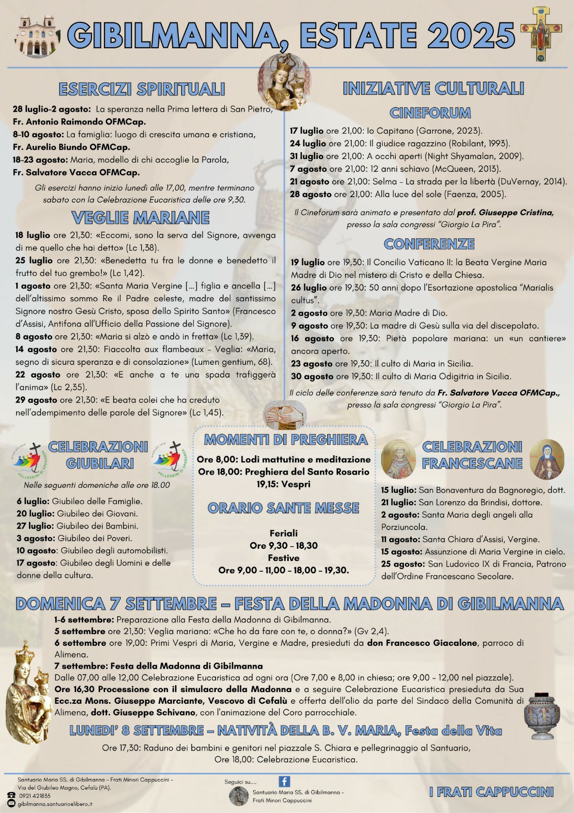 Il Santuario di Gibilmanna si prepara ad accogliere fedeli e visitatori con un ricco programma di eventi per l’estate 2025, pensato per alimentare la fede, approfondire la cultura cristiana e vivere intensi momenti di preghiera e fraternità. Ecco il calendario completo delle iniziative promosse dai Frati Minori Cappuccini.