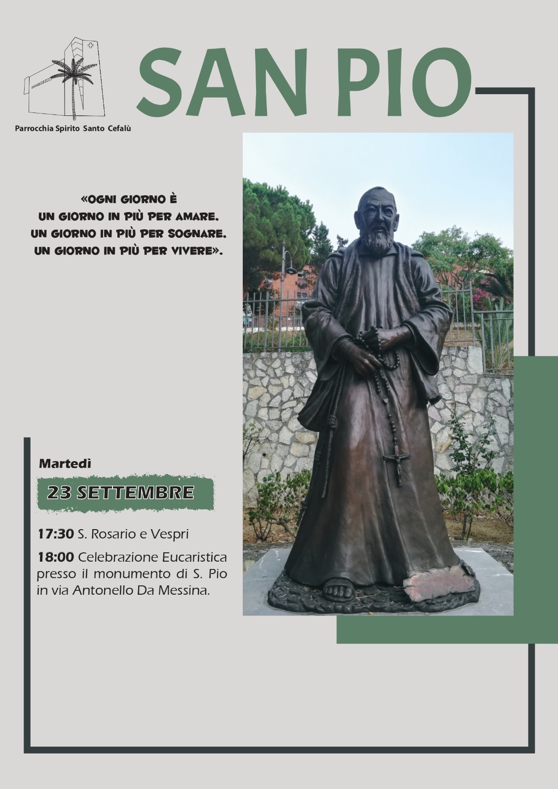 La comunità di Cefalù si prepara a vivere con intensa partecipazione la Festa di San Pio, che si terrà il prossimo 23 settembre presso la piazzetta a lui dedicata in Via Antonello da Messina, nel quartiere Spinito. È qui, ai piedi della statua del frate stigmatizzato, che i fedeli si raduneranno per un momento di preghiera e di grazia.