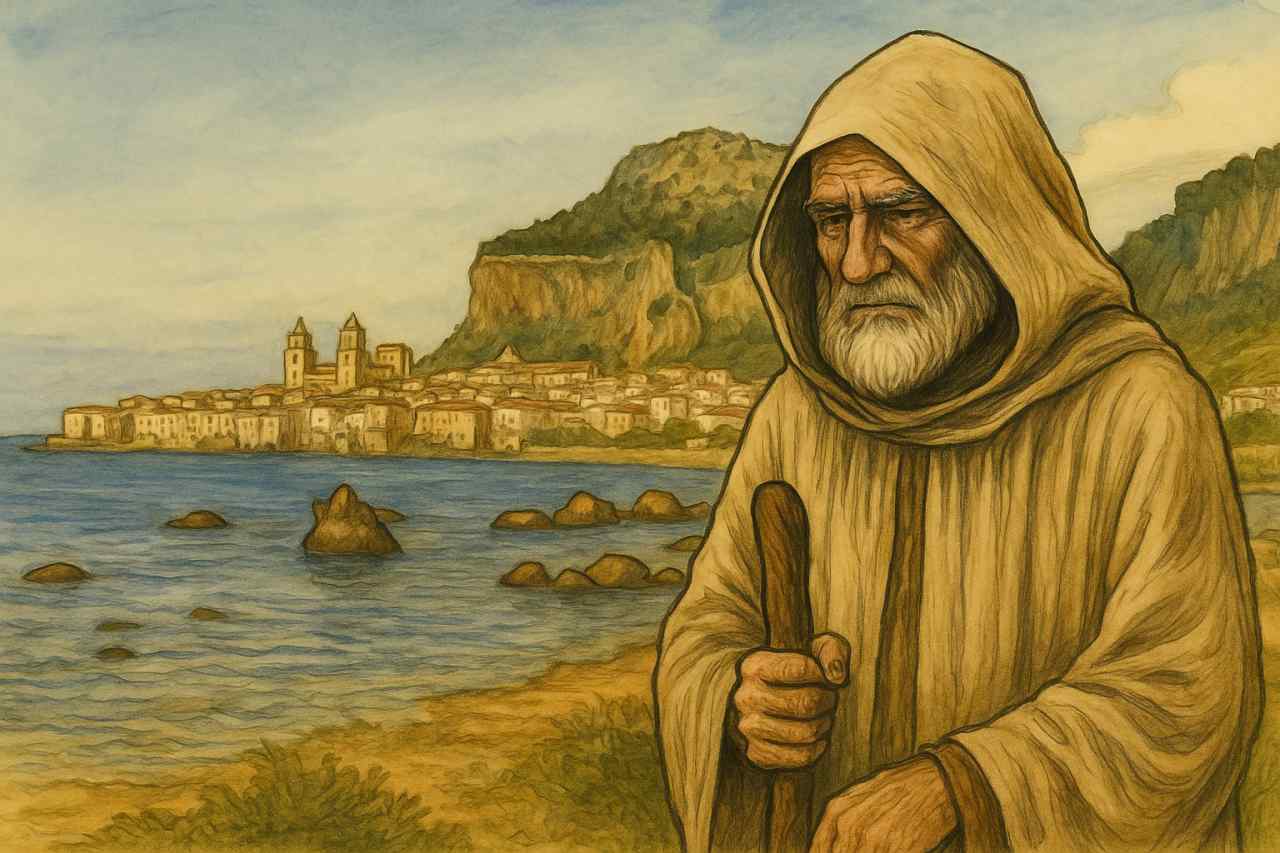 La copertina del romanzo, evocativa e fortemente simbolica, mostra un viandante dal volto solenne, avvolto in un saio color terra, mentre cammina con un bastone tra la Cattedrale di Cefalù e la Rocca che domina la città. L’atmosfera calda e seppiata, quasi da affresco medievale, restituisce al lettore la sensazione di un racconto sospeso tra la storia reale e la leggenda, tra la terra e il cielo, come se l’intera città fosse parte del mistero che il romanzo svela.