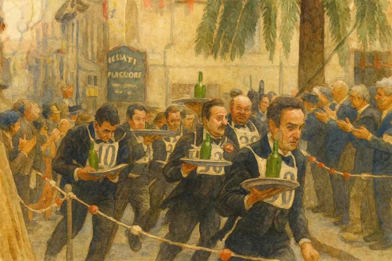 Nell’immagine: l’insolita gara di velocità fra i camerieri locali che si corre in Piazza Duomo a Cefalù.