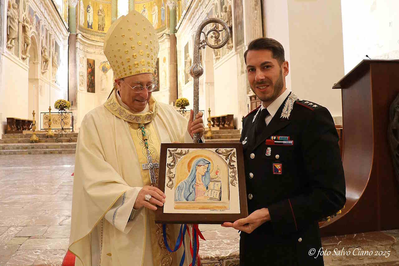 Durante la celebrazione, il Capitano della Compagnia Carabinieri di Cefalù, Cap. Marco Merola, ha offerto al Vescovo un prezioso e raffinato quadro raffigurante Maria Santissima Virgo Fidelis, dono carico di simbolo e gratitudine. L’opera, espressione di profonda devozione, intende sottolineare il legame spirituale che unisce l’Arma dei Carabinieri alla Vergine Fedele, sua Patrona dal 1949.