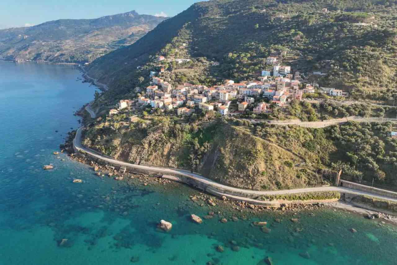 La prima cosa che colpisce di Sant’Ambrogio è che non è davvero un “villaggio” nel senso tradizionale. Non esiste una piazza centrale, non esiste un corso principale che ordina la vita pubblica. È un disegno sparso di case, terrazze, fondi, sentieri che salgono verso le colline o scendono verso il mare. Da ogni punto si intravede l’azzurro del Tirreno, ma mai allo stesso modo: a volte violento, a volte pastello, a volte nascosto tra ulivi e fichi d’India.