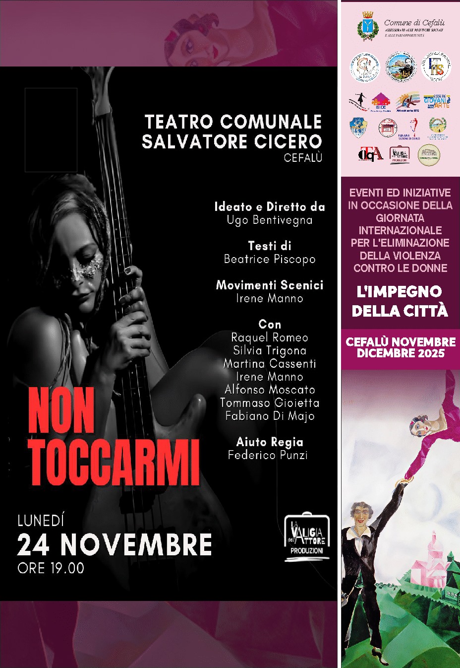 Per la Giornata Internazionale per l’Eliminazione della Violenza contro le Donne, va in scena Non Toccarmi, un’opera teatrale intensa e simbolicamente densa, ideata e diretta da Ugo Bentivegna e prodotta da La Valigia dell’Attore.