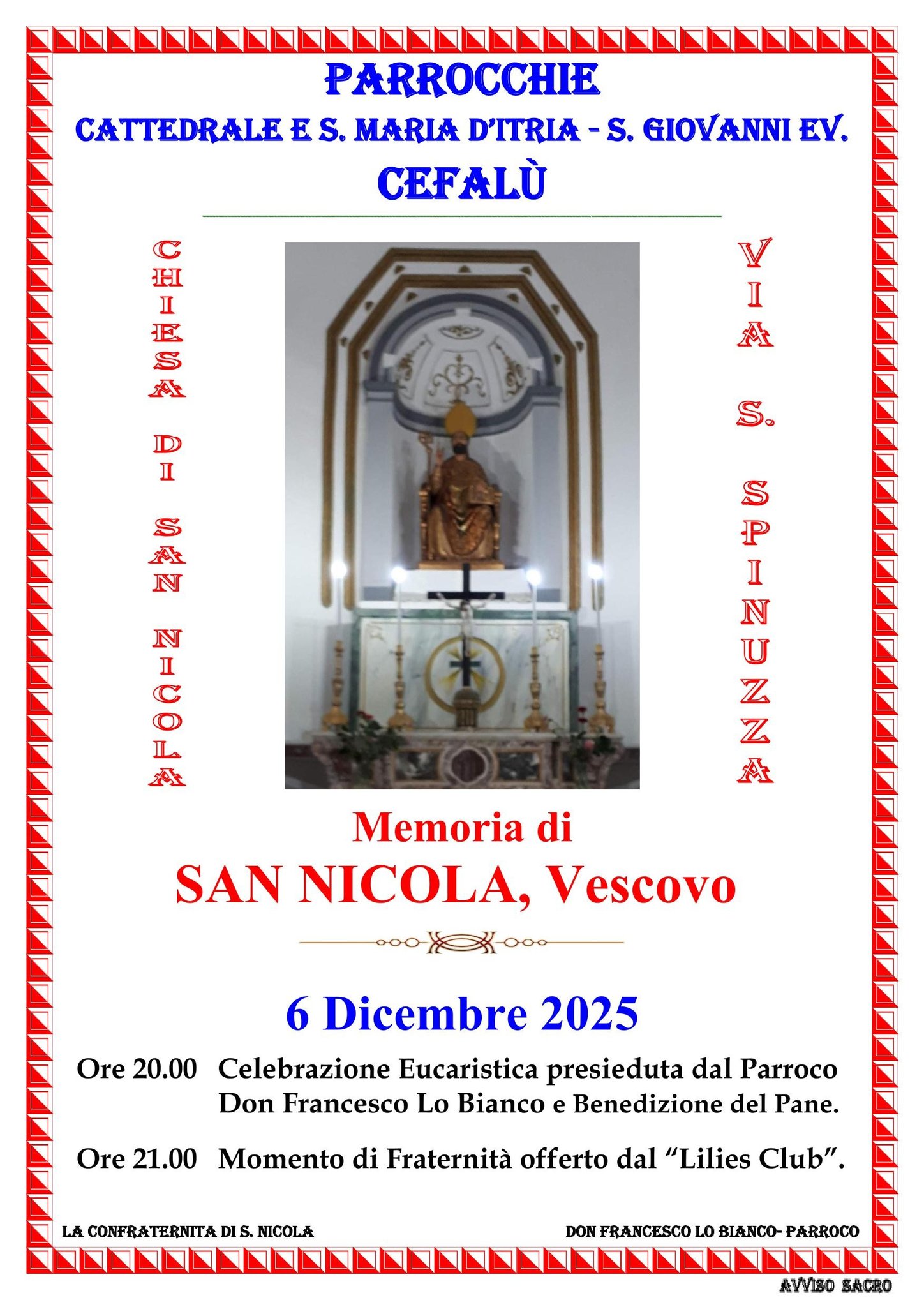 La memoria liturgica di San Nicola, vescovo, celebrata il 6 dicembre, invita la comunità cristiana a contemplare la figura luminosa di un Pastore che unisce in sé la fermezza della fede e la tenerezza della misericordia. La sua vita, collocata nel cuore del IV secolo, rappresenta una sintesi straordinaria tra dottrina e carità, tra custodia dell’ortodossia e attenzione ai più piccoli. Cefalù ha dedicato una Chiesa, in Via Spinuzza, e una confraternita molto attiva e numerosa. E Domani sarà Festa Solenne con