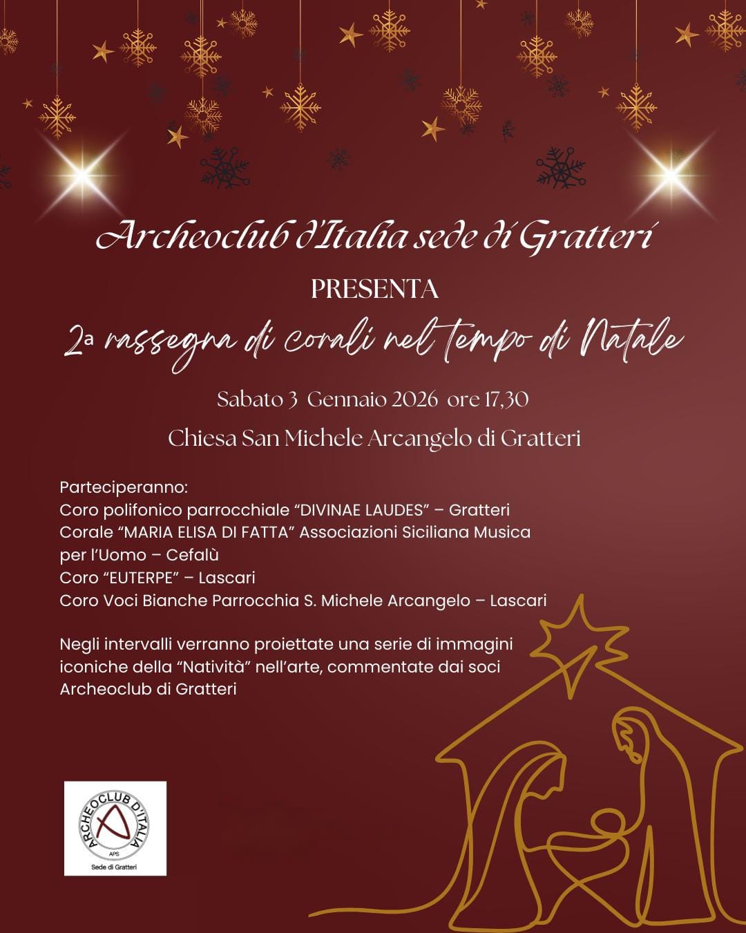 A impreziosire ulteriormente l’evento, negli intervalli musicali verrà proposta la proiezione di una selezione di immagini iconiche della Natività nell’arte, commentate dai soci dell’Archeoclub di Gratteri. Un percorso visivo e narrativo che guiderà il pubblico tra capolavori e simboli, offrendo chiavi di lettura storiche e spirituali per comprendere come l’evento del Natale abbia ispirato nei secoli artisti, comunità e culture.